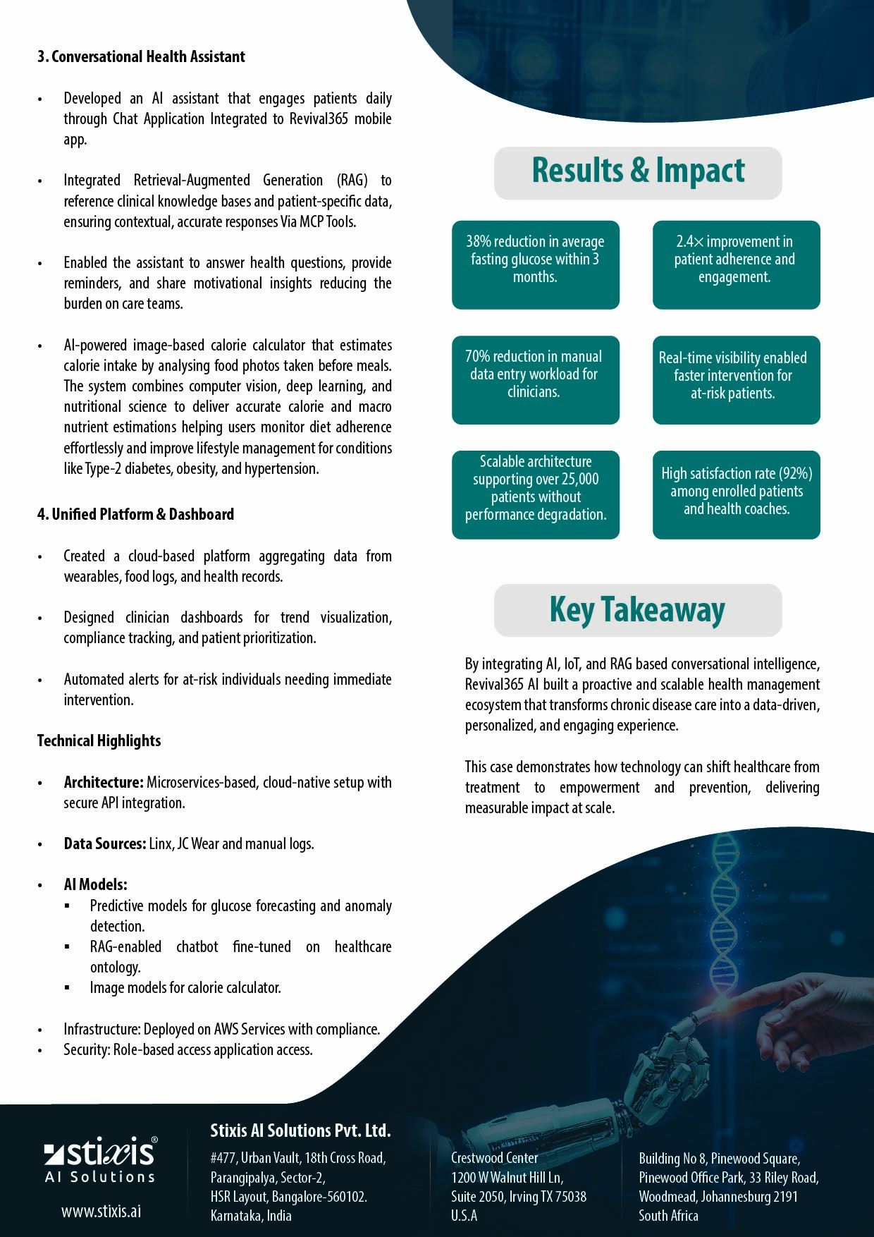 The solution leverages AI-driven insights from health data such as blood glucose readings, physical activity, sleep, stress indicators, and nutritional inputs, combined with IoT integrations including Continuous Glucose Monitoring (CGM) devices and wearable health trackers. Revival365 AI continuously adapts personalized recommendations across diet, exercise, stress management, and medication adherence, supported by nudges, alerts, and predictive risk indicators.